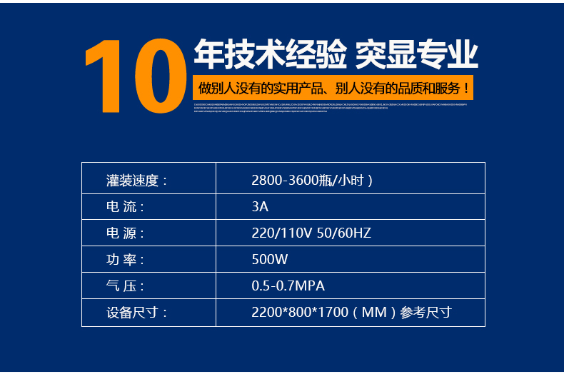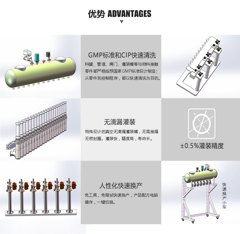 1、獨特的專為不滴漏而設計的多款式灌裝頭及回吸系統,確保生產現場及包裝成品不受液料污染;