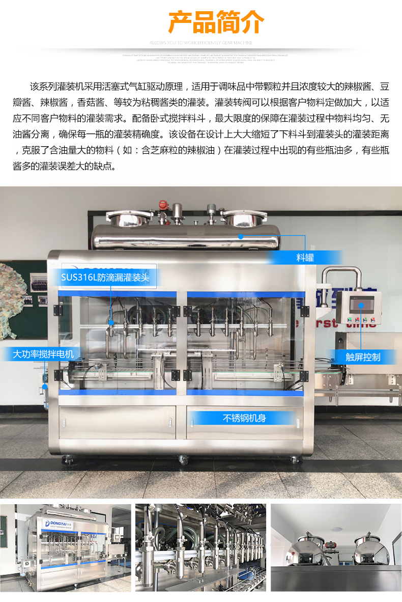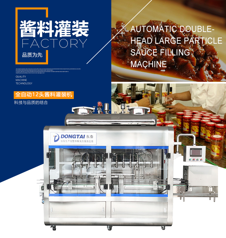 2、辣椒醬灌裝機以進口PLC電腦控制的全彩色觸摸屏人機界面,確保容量之調整簡易、快捷、準確。是任何形式的窖灌裝機無法替代的;