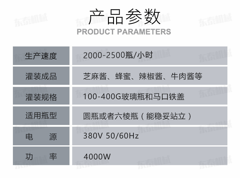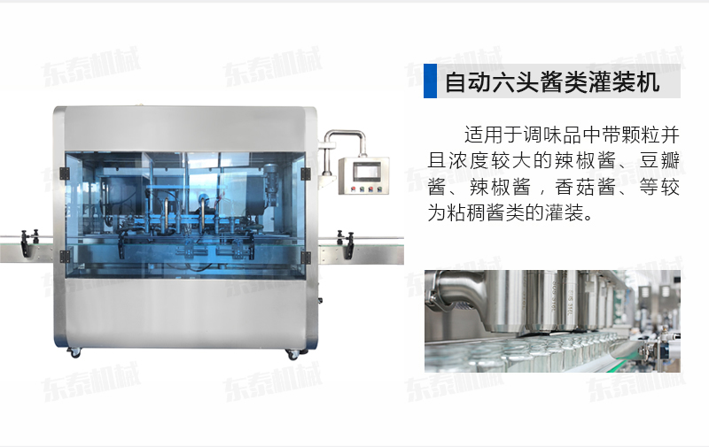 該醬體灌裝機生產(chǎn)線采用活塞式氣缸驅(qū)動原理,適用于調(diào)味品中帶顆粒并且濃度較大的辣椒醬、豆瓣醬、辣椒醬,香菇醬、等較為粘稠醬類的灌裝。灌裝轉(zhuǎn)閥可以根據(jù)客戶物料定做加大,以適應(yīng)不同客戶物料的灌裝需求。配備臥式攪拌料斗,大限度的保障在灌裝過程中物料均勻、無油醬分離。該設(shè)備在設(shè)計上大大縮短了下料斗到灌裝頭的灌裝距離,克服了含油量大的物料(如:含芝麻粒的辣椒油)在灌裝過程中出現(xiàn)的有些瓶油多,有些瓶醬多的灌裝誤差大的缺點。
