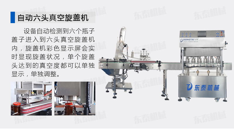 該直線式真空旋蓋機是東泰機械結(jié)合用戶使用的情況,摒棄了傳統(tǒng)轉(zhuǎn)盤式真空旋蓋機的弊端,研制開發(fā)的設(shè)備,設(shè)備自動檢測到六個瓶子蓋子進入到六頭真空旋蓋機內(nèi),旋蓋機彩色顯示屏?xí)崟r顯現(xiàn)旋蓋狀況,整機多點檢測,當(dāng)進口無瓶無蓋、出口堵塞、定位不準、瓶身傾倒均自動停機。單個旋蓋頭達到的真空度都可以單獨顯示,單獨調(diào)整!