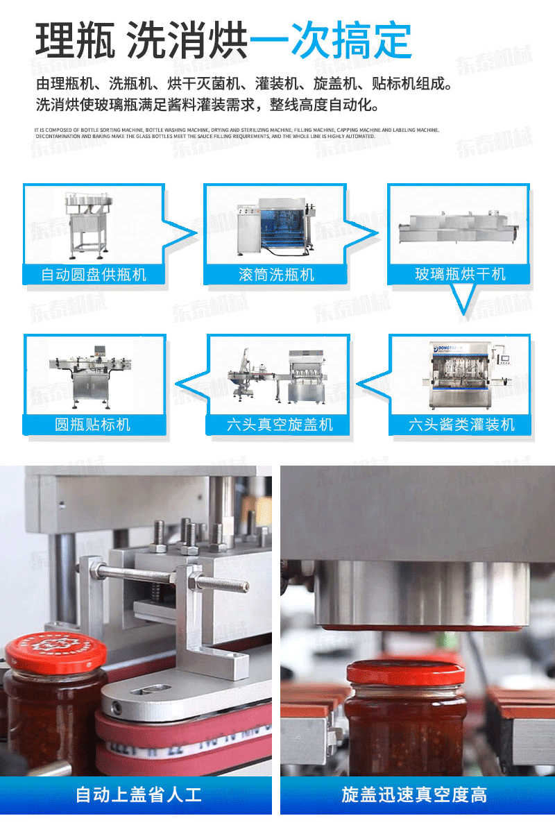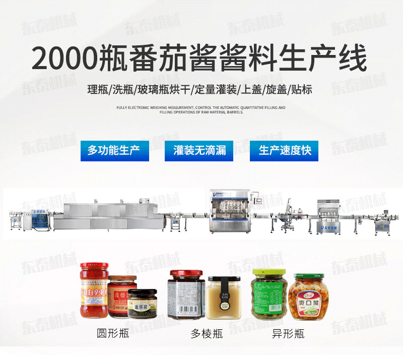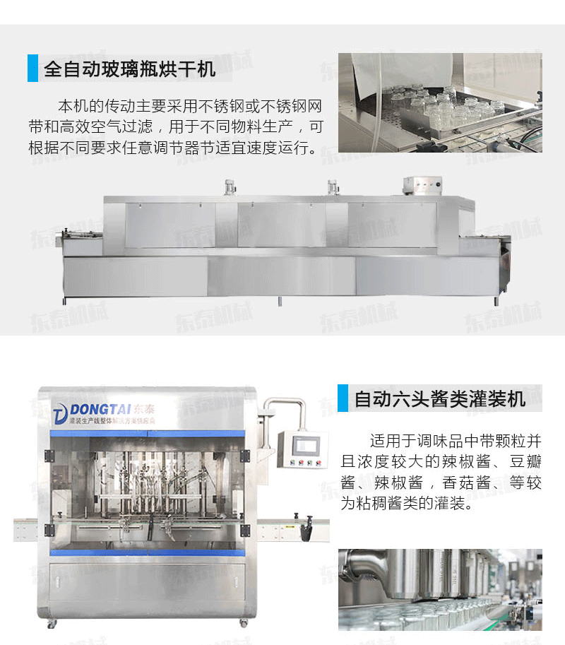 A、番茄醬灌裝機生產線基礎上進行改良設設計,醬料防滴防漏灌裝頭,在灌裝過程中不污染瓶口及瓶身,方便后續的旋蓋和貼標工序。
