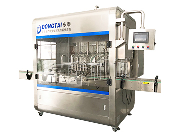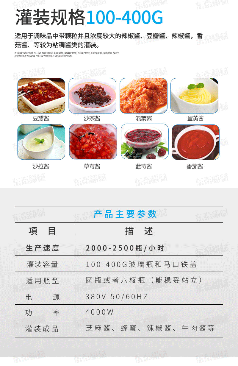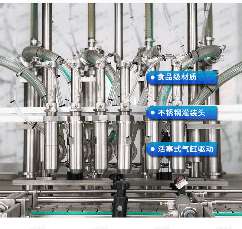 B、灌裝機采用橫推料的方式,縮短了下料斗到灌裝頭的距離,提高了灌裝速度,更重要的是解決了含油量大的物料在灌裝過程中出現的有的瓶油多,有些瓶醬多的灌裝難.,大大提高了灌裝精度。