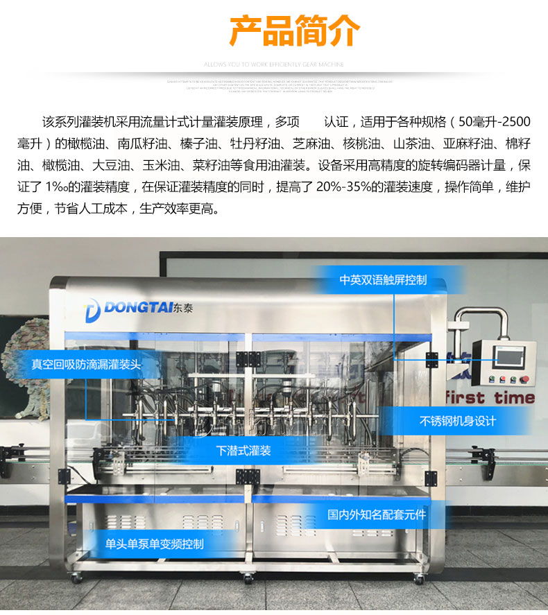 該食用油灌裝機采用流量計式計量灌裝原理,多項認證,適用于各種規(guī)格(1-5升)的南瓜籽油、榛子油、牡丹籽油、芝麻油、核桃油、山茶油、亞麻籽油、棉籽油、橄欖油、大豆油、玉米油、菜籽油等食用油灌裝。設備采用高精的旋轉編碼器計量,保證了1%o的灌裝精度,在保證灌裝精度的同時,提高了20%-35%的灌裝速度,操作簡單,維護方便,節(jié)省人工成本,生產效率更高。